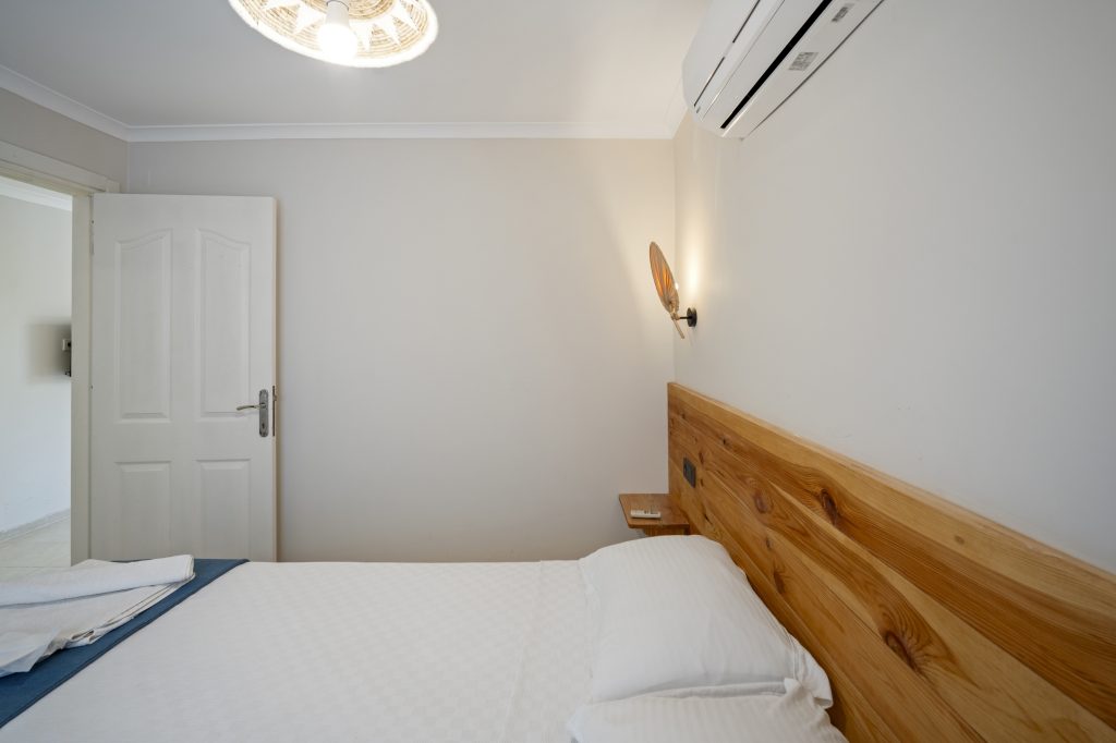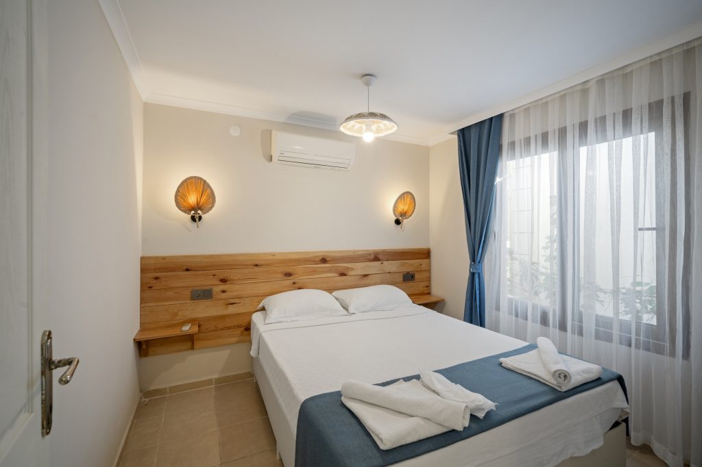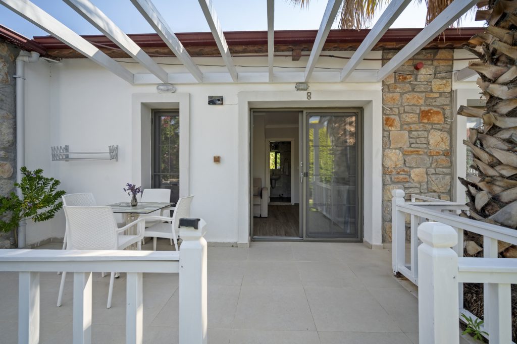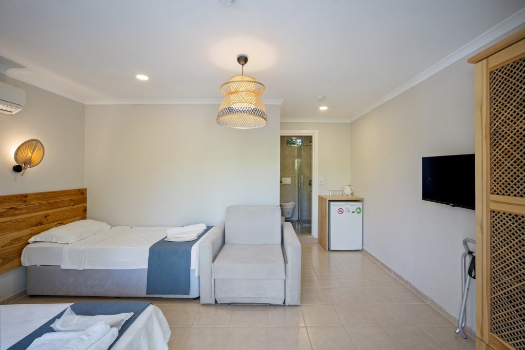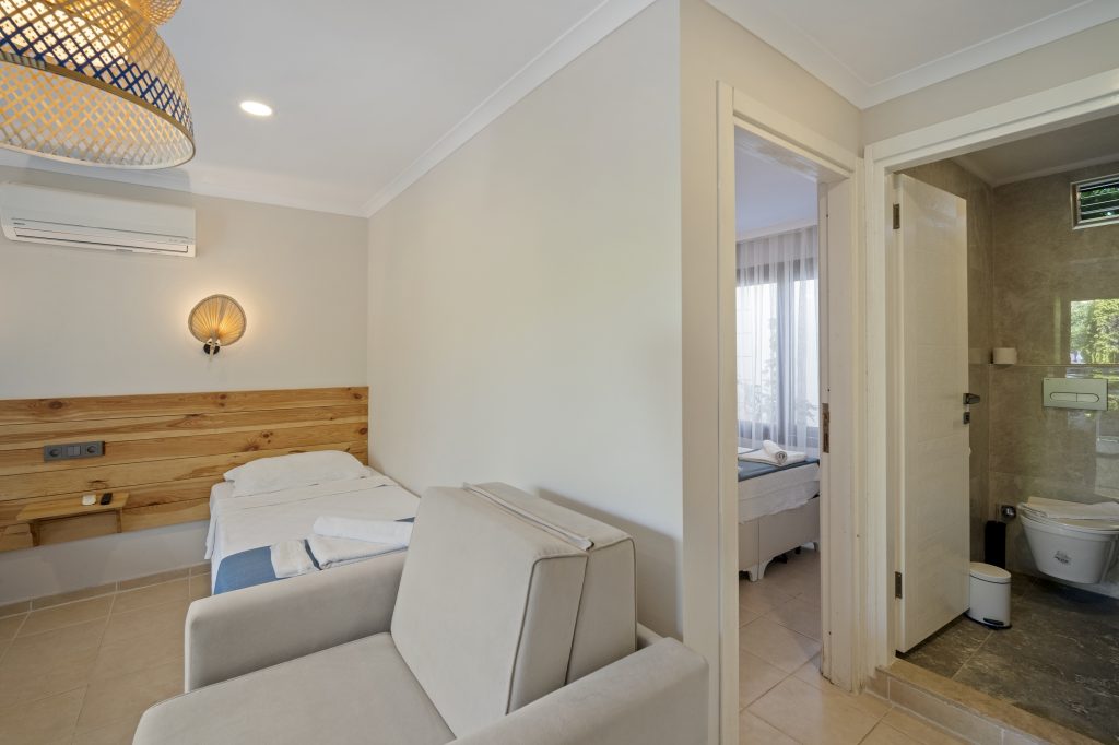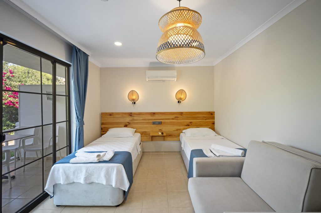 Tesisimizde 8 adet bulunan bu oda tipimiz, Akdeniz tarzında döşenmiştir. 40 m2, 1 adet çift kişilik yataklı ebeyn odası, açık mutfak (yemek pişirilememektedir), salonda 2 adet tek kişilik yatak veya 1 adet tek kişilik yatak ve 1 adet açılır yetişkin kullanımına uygun kanepe bulunmaktadır. Her iki odada da klima mevcuttur.