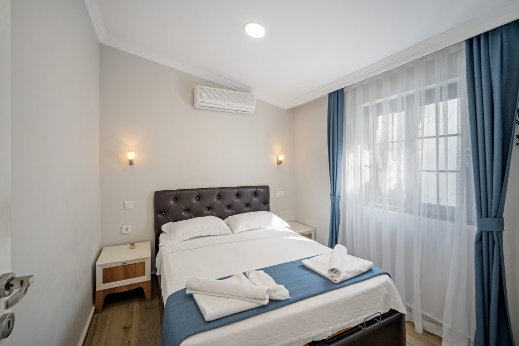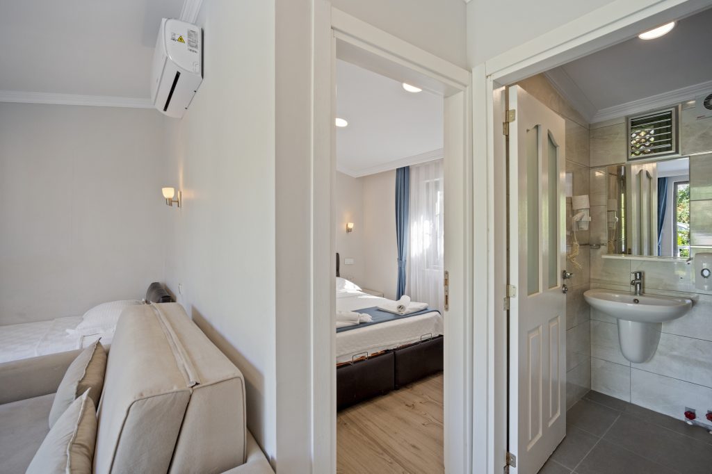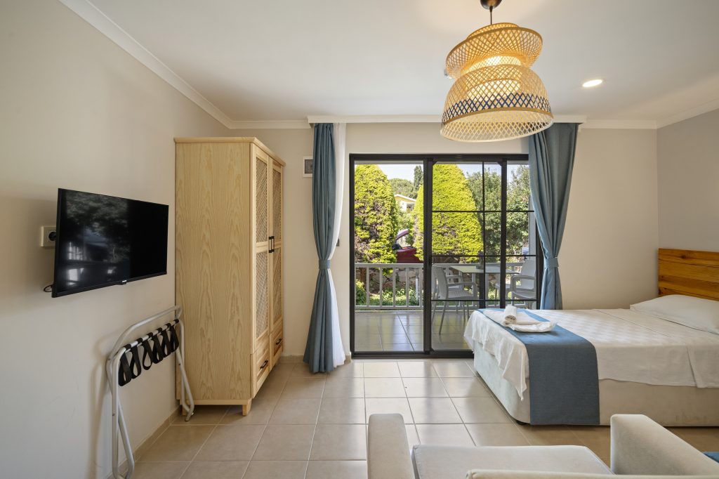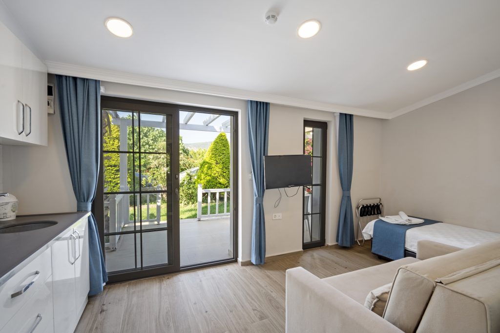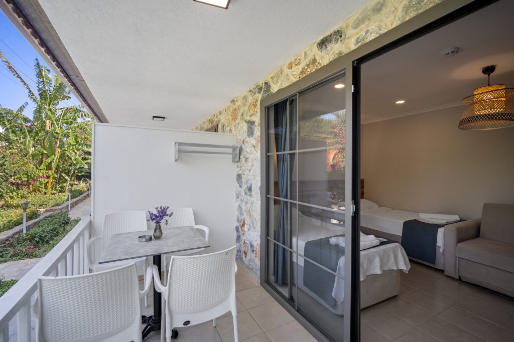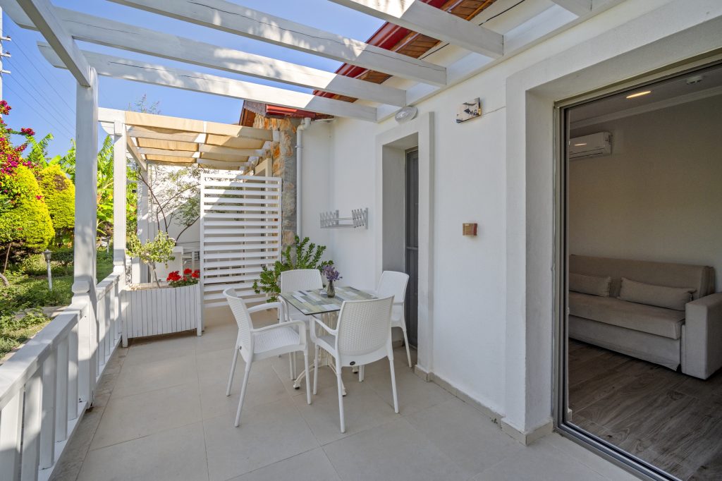Tesisimizde 8 adet bulunan bu oda tipimiz, Akdeniz tarzında döşenmiştir. 40 m2, 1 adet çift kişilik yataklı ebeyn odası, açık mutfak (yemek pişirilememektedir), salonda 2 adet tek kişilik yatak veya 1 adet tek kişilik yatak ve 1 adet açılır yetişkin kullanımına uygun kanepe bulunmaktadır. Her iki odada da klima mevcuttur.